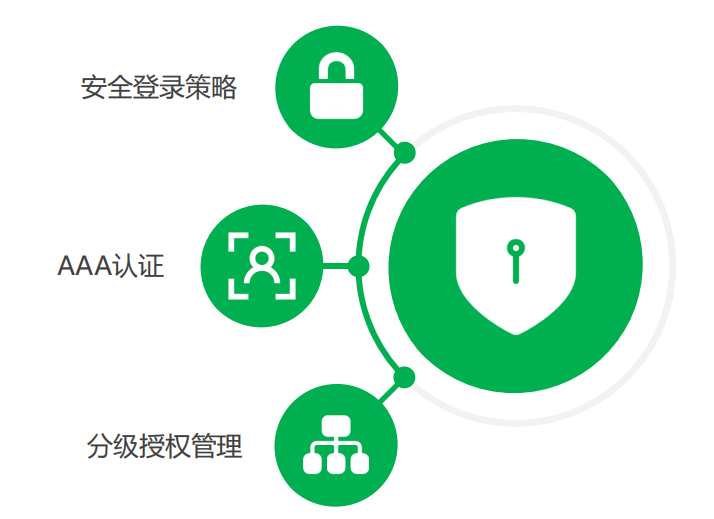 Https、SSH2等安全登录策略,并且支持AAA(TACACS,Radius,本地认证)和用户分级授权管理,实现设备集中认证授权管理的安全机制。