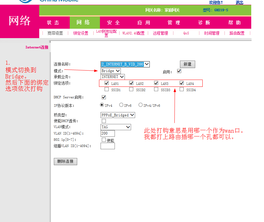 然后,选择模式。默认的模式是光猫拨号。我们要选择成桥接拨号。故选择Bridge选项。下面的绑定选项你可以选一个也可以选多个。我都选了。目的是只有选上的口才可以链接路由。所以我都选了。