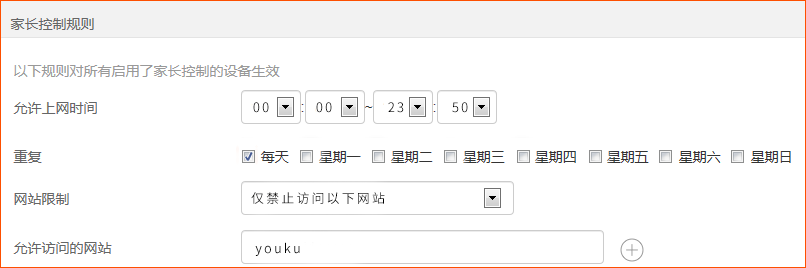 在“网站限制”选择“仅禁止访问以下网站”,然后输入禁止访问的网站关键词,如输入youku则表示禁止访问优酷网站。最后点击确定即可。