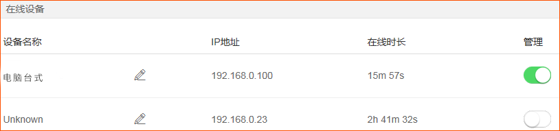 2.点击左边菜单“家长控制”,选择要控制的设备,点击“管理”快关至开启状态,如果需要限制上网时间,可以在“允许上网时间”填上相应时间段,这里不细说。