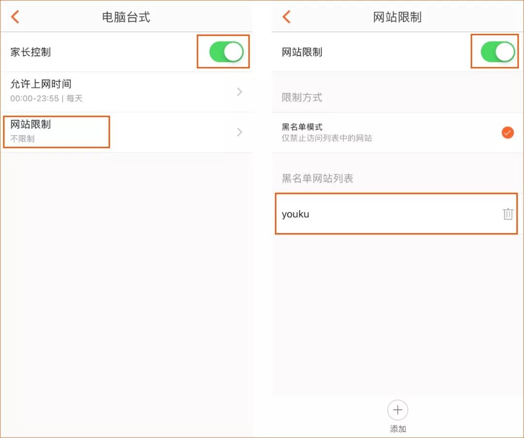 2.选择你想要限制的设备,选择“家长控制”并启用该功能,在“网络限制”中添加禁止访问的网站关键词,如输入youku则表示禁止访问优酷网站。