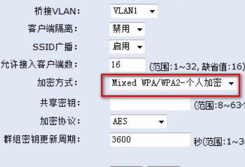 6、设置SSID,加密方式设为MixeWPA/WPA2-个人加密,进行选择密钥的设置。