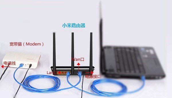 首先接通小米路由器电源,将宽带线路与小米路由器蓝色“Internet接口”或“WLAN”接口相连,然后利用网线将小米路由器黑色LAN口与电脑网卡相连就可以了。